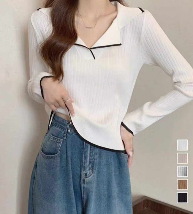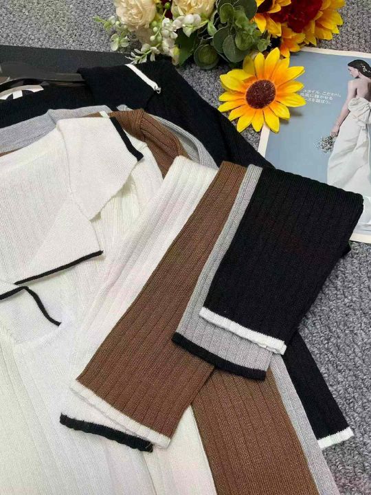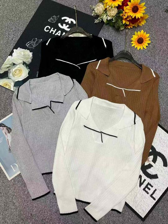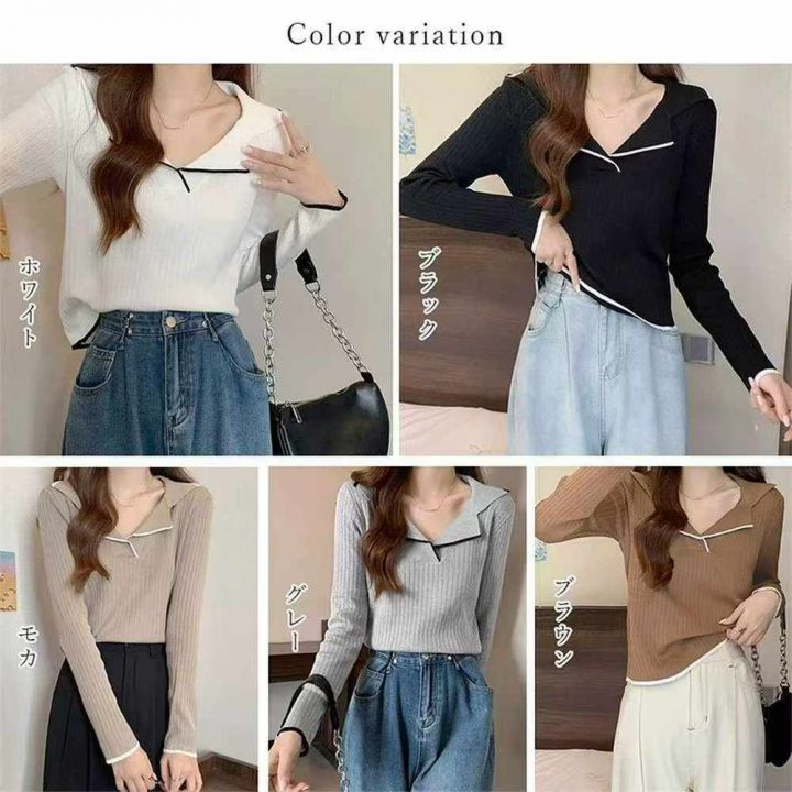 春季新款拼色设计感小众弹力修身显瘦polo领长袖针织毛...