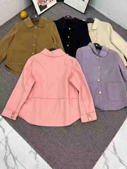 480件春秋款轻奢品大牌娃娃领金标羊毛双面尼子大衣外套,单款5色,码数S-L码。全部防尘袋带衣架装。
