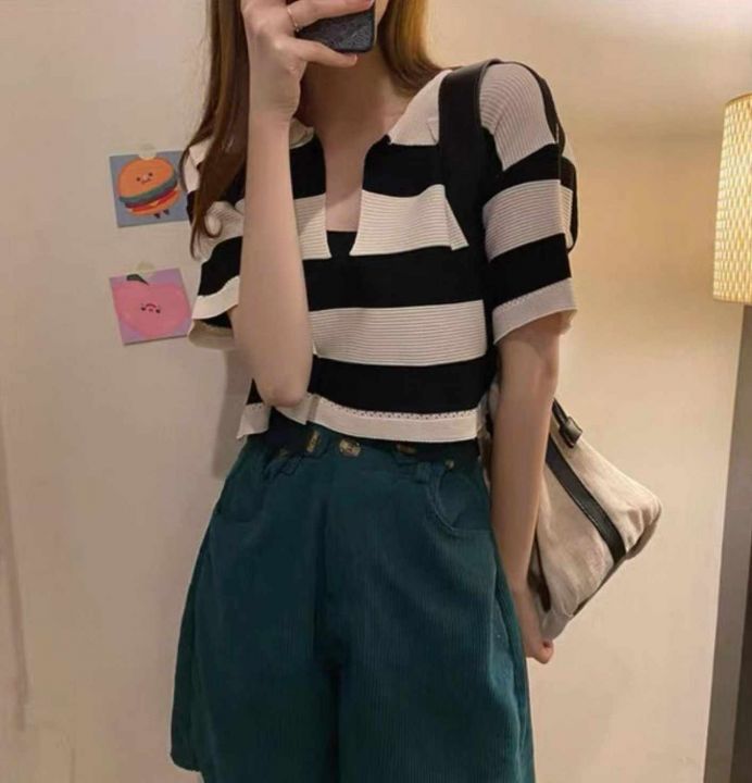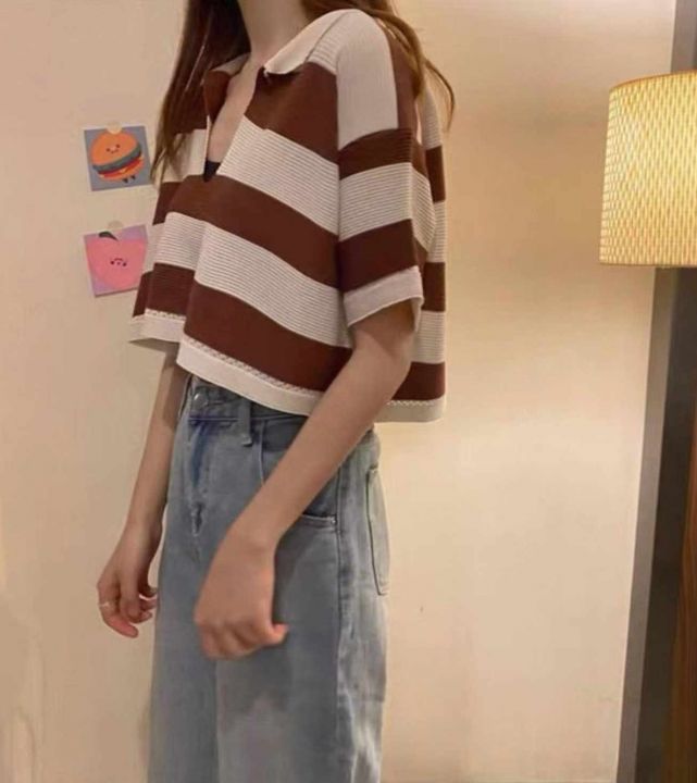 夏季新款撞色条纹宽松百搭Polo领针织短袖T+弹力修身显...