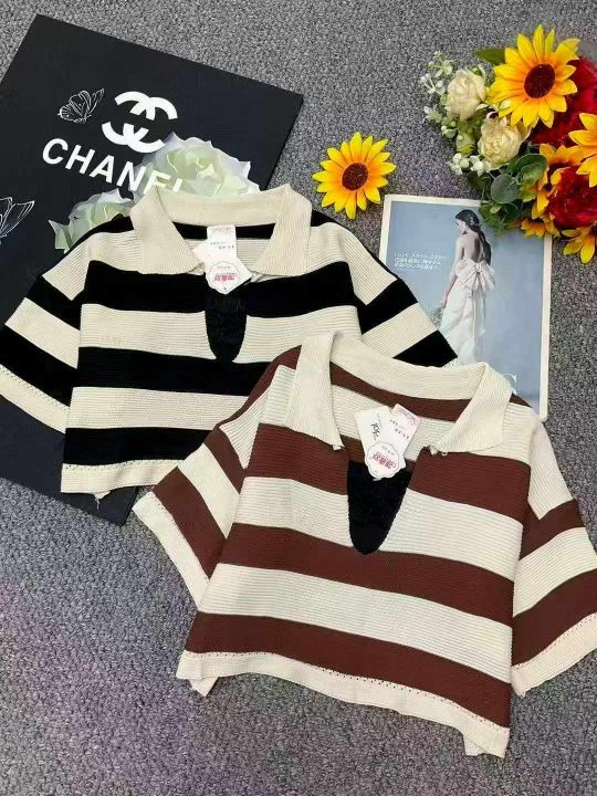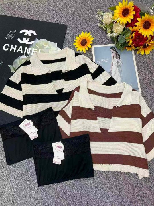 夏季新款撞色条纹宽松百搭Polo领针织短袖T+弹力修身显瘦黑色抹胸2件套,独立包装,均码面料柔软舒适弹力大,160套左右,全清5.9元超低价秒杀!