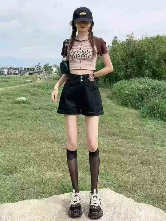夏季爆款高品质女装洗水棉双排扣设计感高腰阔腿牛仔短...