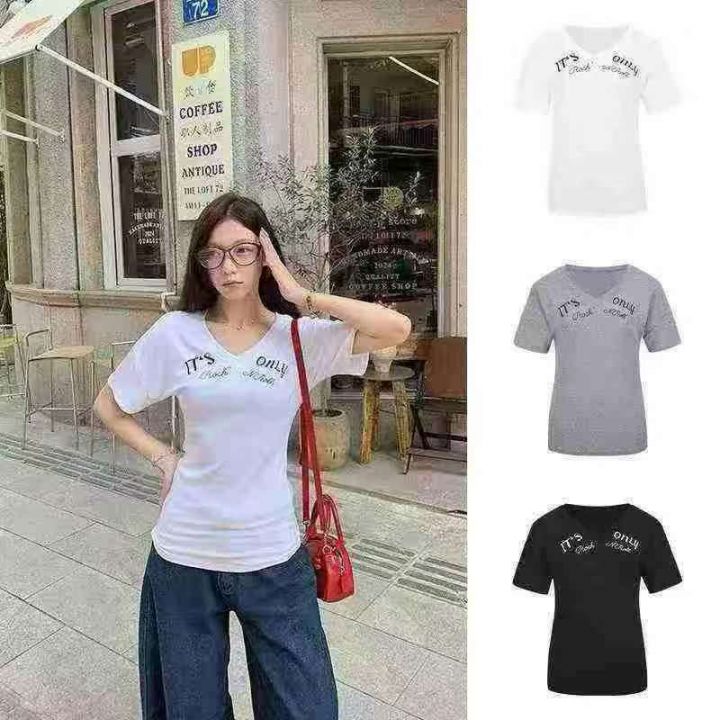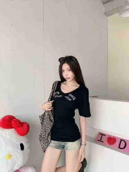 韩版V领设计感独特别致辣妹T恤,[爱心]130件左右,款号#1156,码数S-XL,穿70-120斤,万佳档口货,原包装️无瑕疵,[666]实体店品质