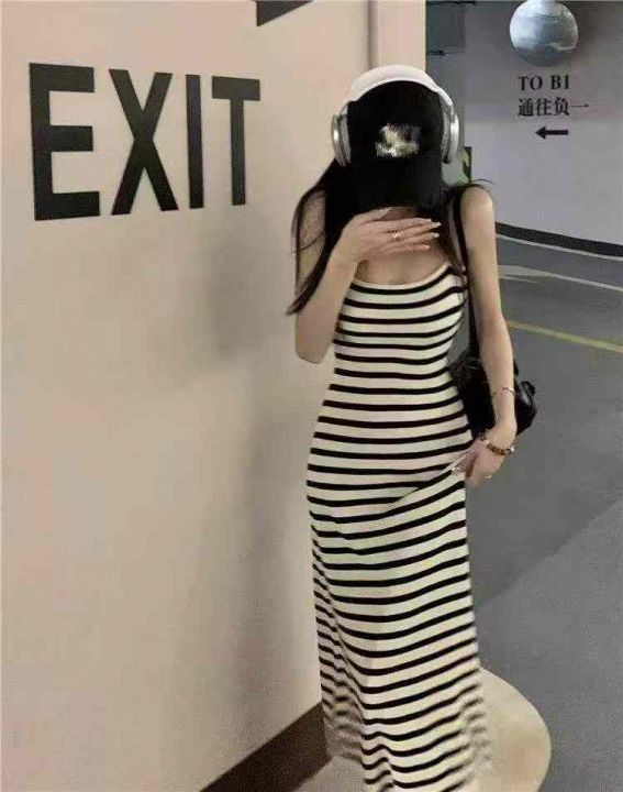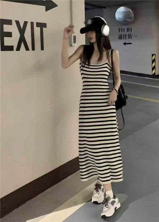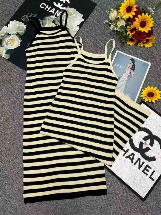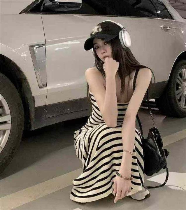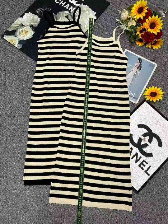 夏季新款法式撞色条纹复古针织吊带连衣裙,独立包装,...