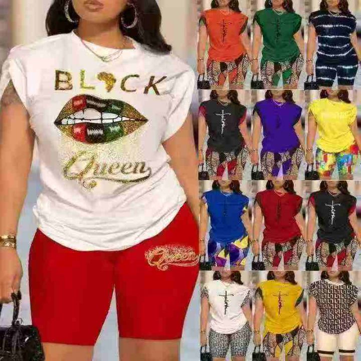 7.8清115套跨境电商夏季新款欧美女装亚马逊气质数码印花圆领短袖套装 码数S-3XL 独立包装