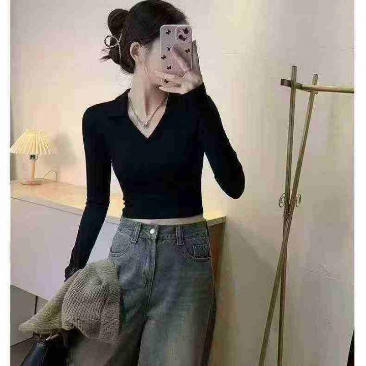 1200件韩系辣妹polo领显瘦露脐紧靓妹长袖T恤,尺码xs-XL ,面料软糯高弹力...