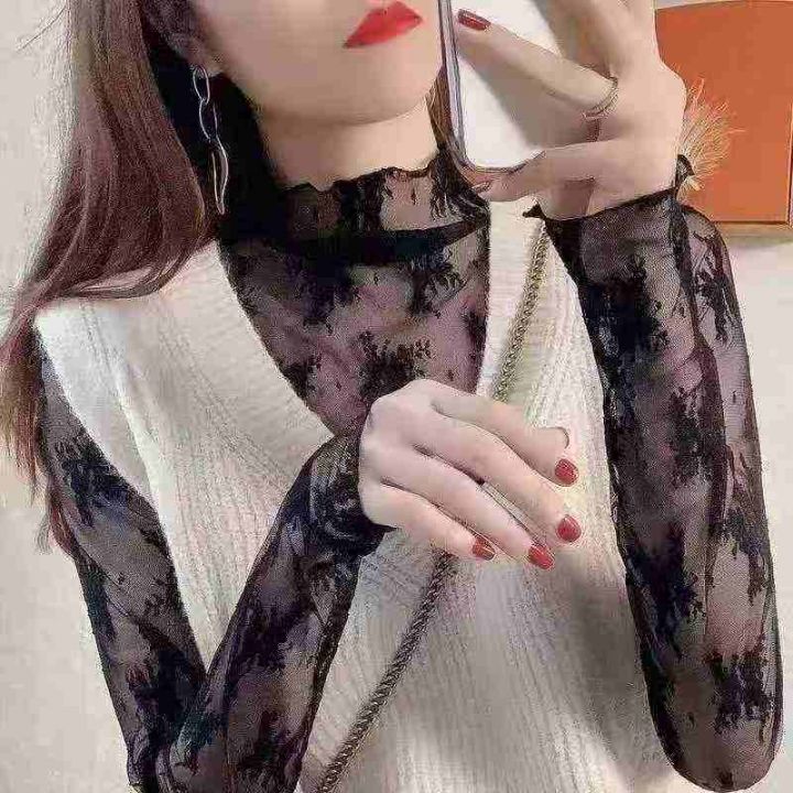 1300件半高领木耳边蕾丝打底衫女玫瑰花法式网纱内搭别致叠穿透视上衣 独立...