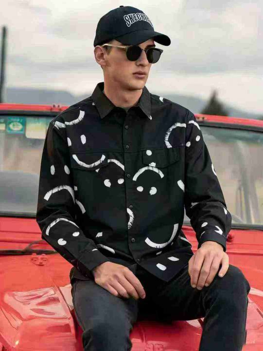 秋季新款笑脸印花休闲长袖衬衫男士时尚百搭宽松方领休闲衬衣 381件 码数:M-3XL (1点到5点)独立包装,模特图只供参考,分货➕1 (货号305#2)