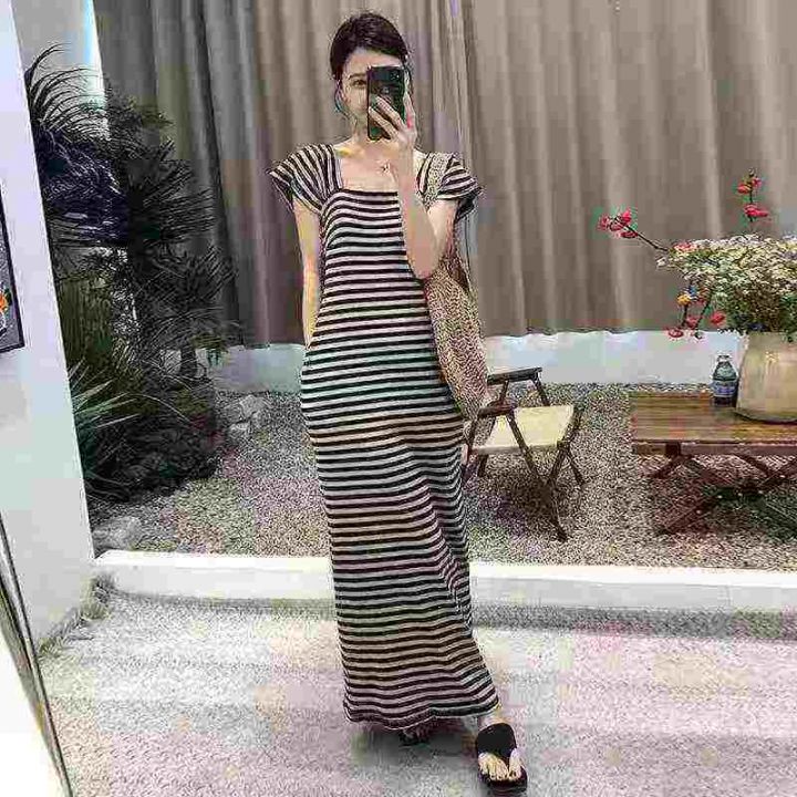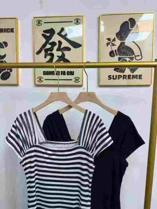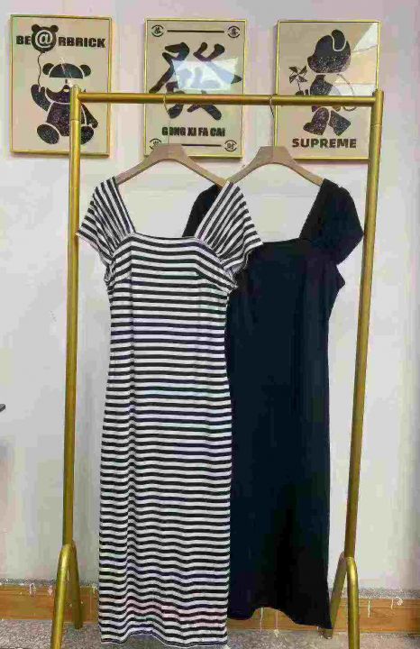 天猫在售款400件左右高品质夏季小个子撞色条纹方领短袖连衣裙,码数S-L,单款两色,高弹力,独立包装带吊牌