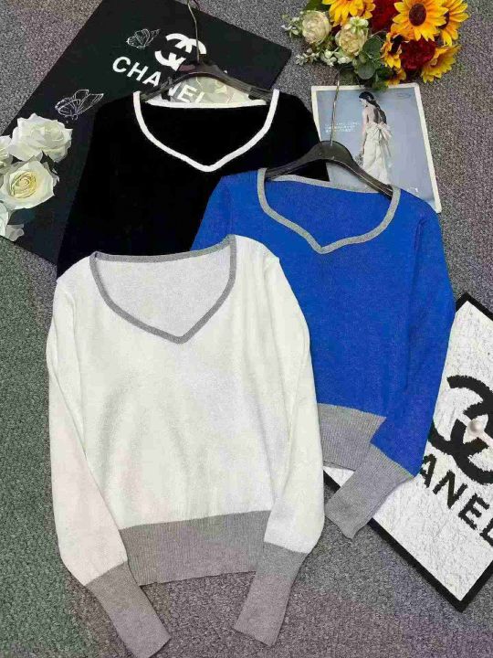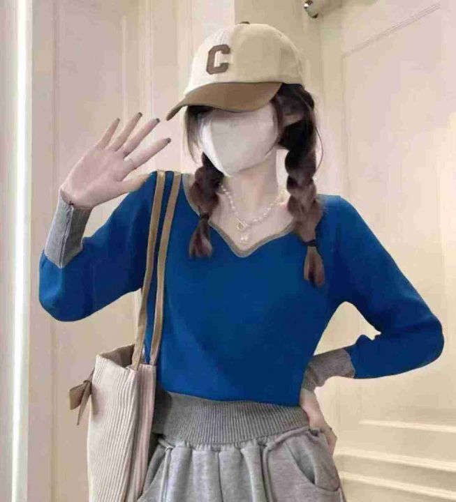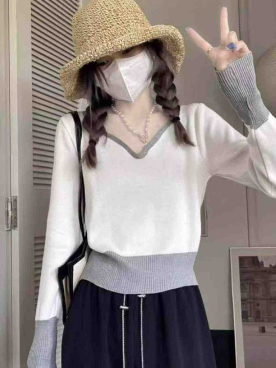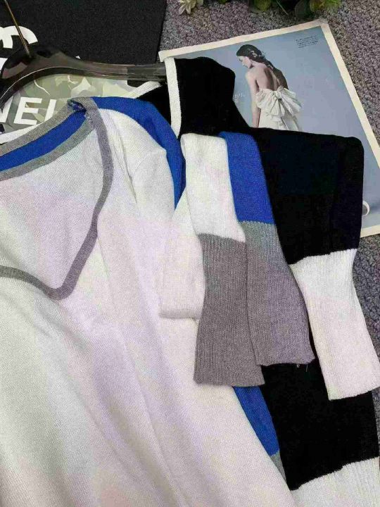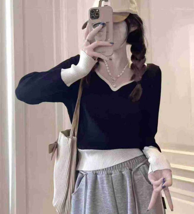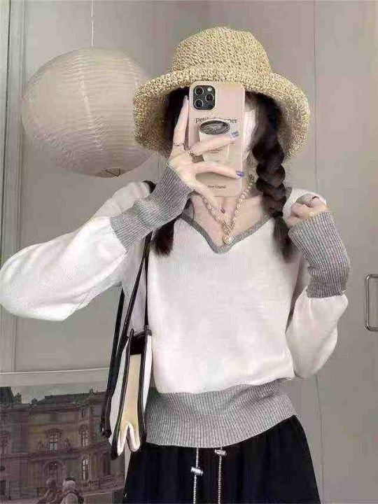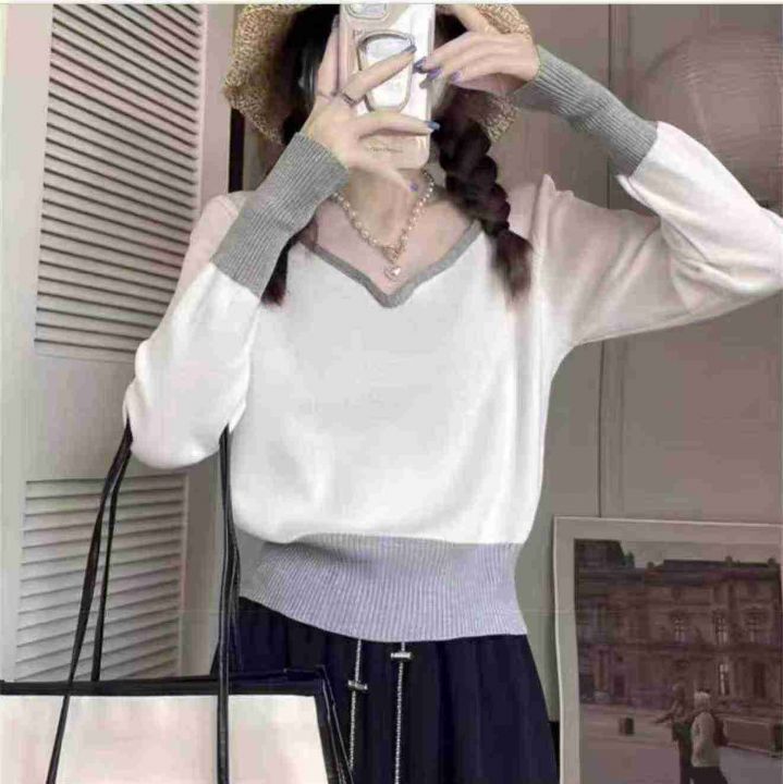 春季新款港风撞色宽松百搭显瘦针织套头毛衣,独立包装...