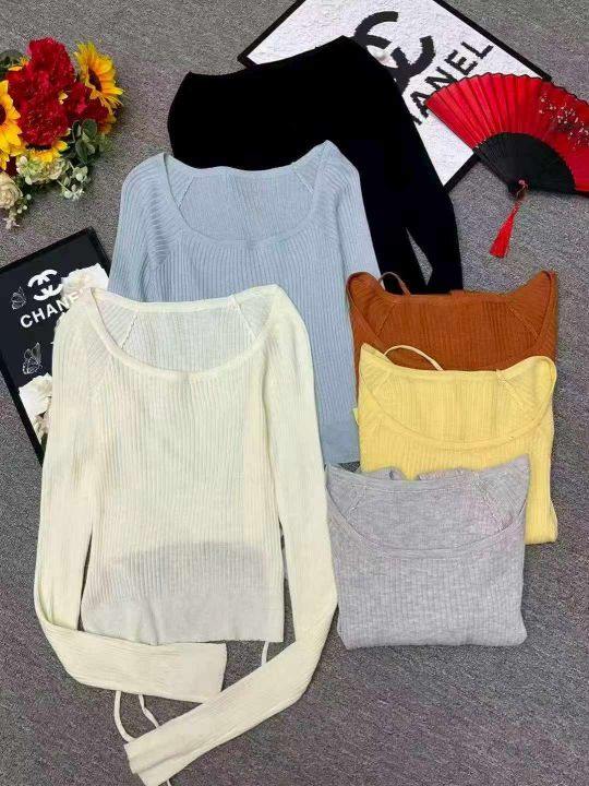 春秋新款法式方领前长后短腰间系带设计感后背露腰短款长袖针织羊毛衫,独立...
