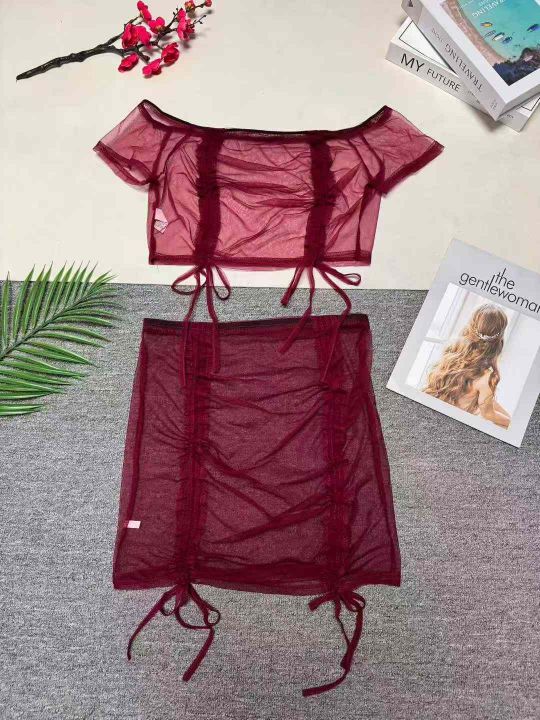 2.5清高级感薄纱半透短袖半身裙性感两件套,整款三色...