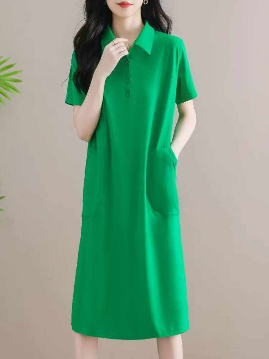 夏季新款中长款宽松百搭微胖MM休闲纯棉POLO领连衣裙,...