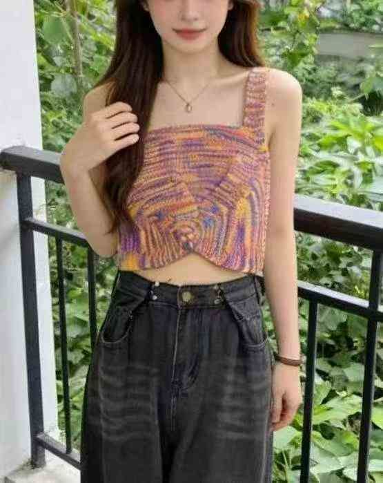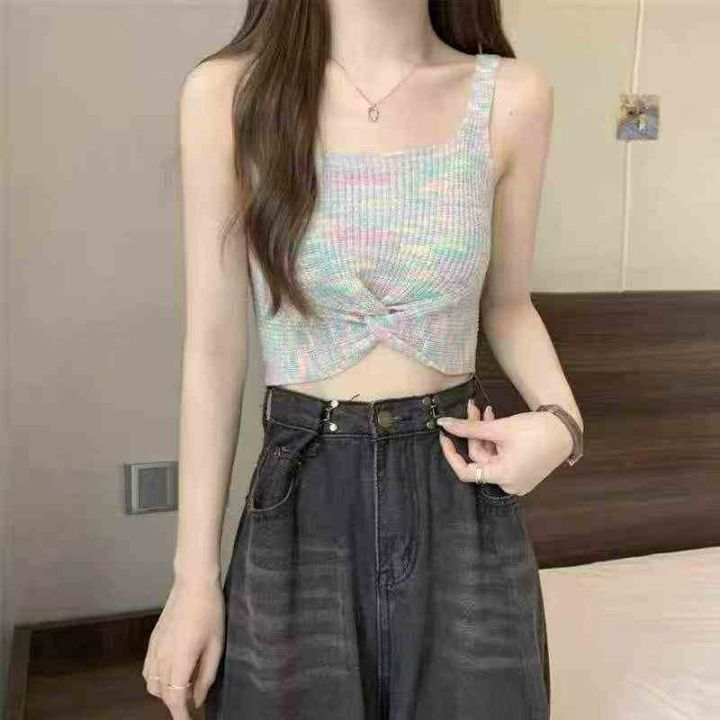 夏季新款辣妹纯欲撞色彩虹条纹设计款针织吊带背心,独...