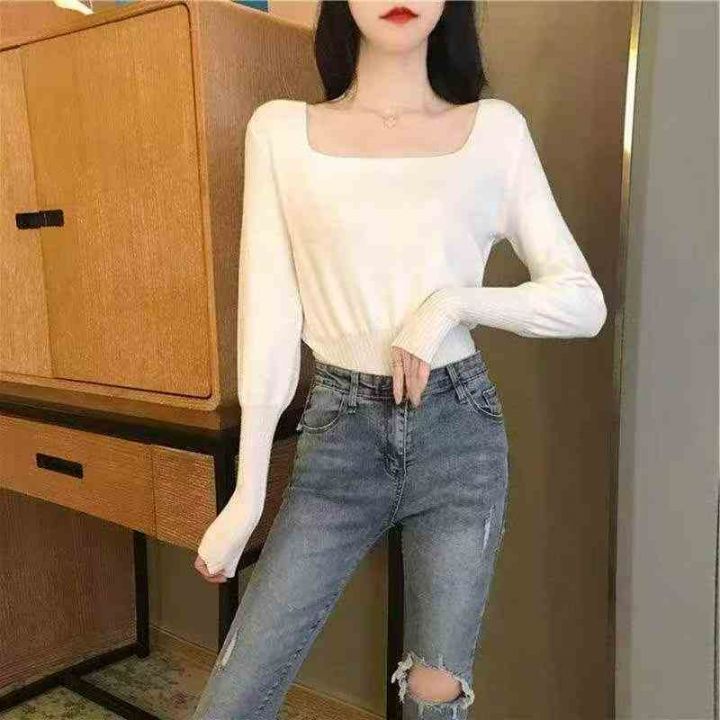 春秋新款薄款法式方领洋气弹力修身显瘦包芯纱套头毛衣...