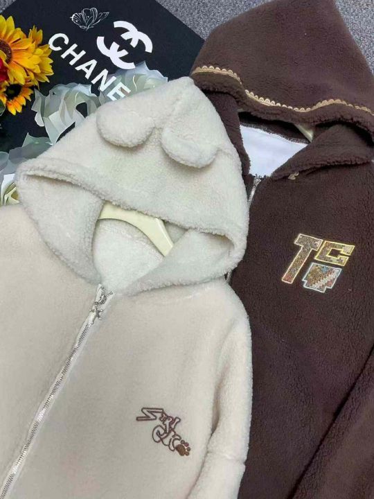 秋冬新款加绒(一体绒)可爱卡通软妹新款宽松百搭保暖羊羔毛连帽拉链外套,...