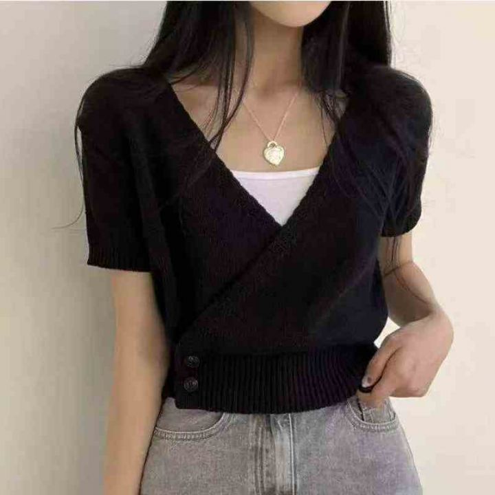 夏季新款法式小众设计感斜襟V领气质两粒扣收腰针织短袖T桖,独立包装,均码面料柔软舒适有弹力,538件,全清4.9元超低价秒杀!分货加一!