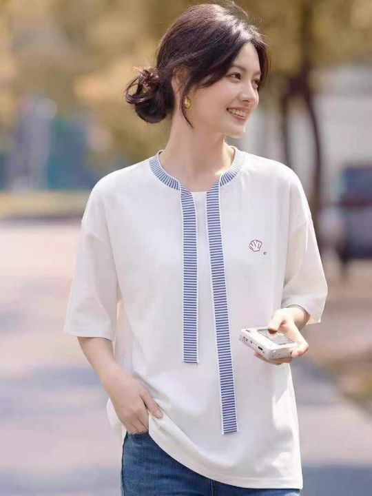 法式拼色飘带夏季设计感刺绣减龄女士纯棉短袖 数量180件左右 尺码S--L 独立包装 大货干净整洁