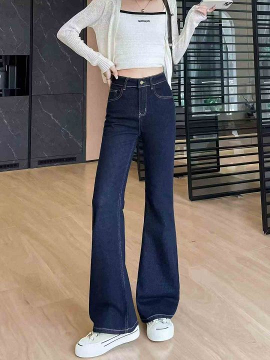 春季新款微胖MM网红复古深蓝色洗水棉直筒微喇叭牛仔长裤,独立拉链包装带吊...