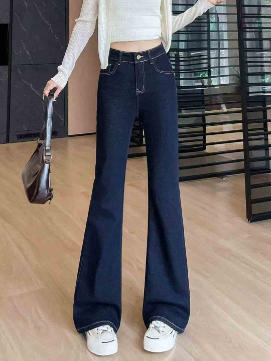 春季新款微胖MM网红复古深蓝色洗水棉直筒微喇叭牛仔长...