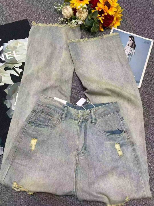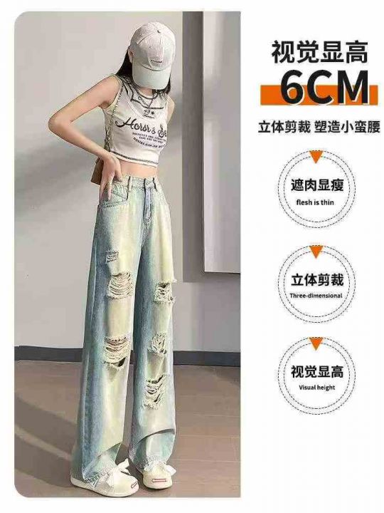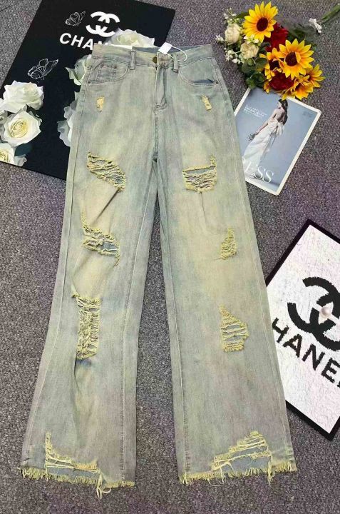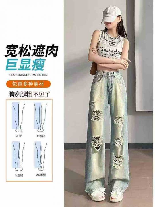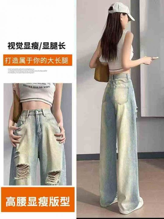 春季新款美式复古宽松破洞直筒阔腿牛仔裤,独立包装带...