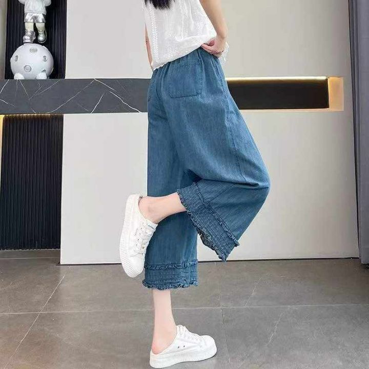夏季新款花边拼接纯色减龄显瘦直筒阔腿牛仔裤,独立包...