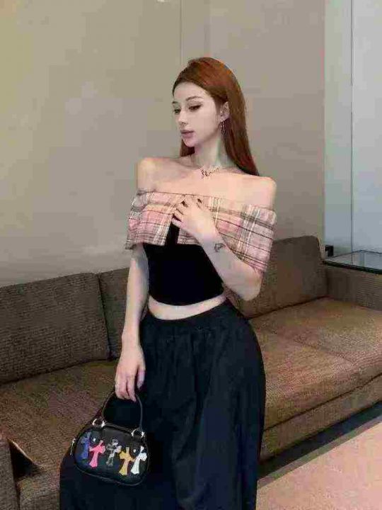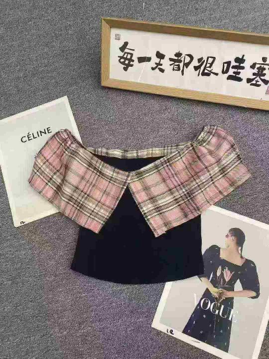 复古格纹一字肩短袖64件7.5,面料舒适透气,有弹力,...