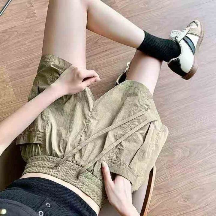 夏季大码女装高腰百搭阔腿裤复古工装口袋短裤