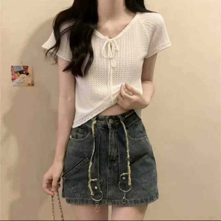 夏季洋气百搭薄款镂空针织设计感小众独特绑带针织小衫,独立包装,900件,...
