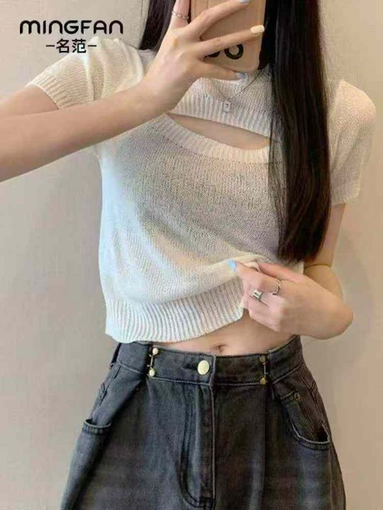 夏季新款不规则镂空正肩辣妹冰丝针织短袖小衫,独立包装,均码面料柔软舒适...
