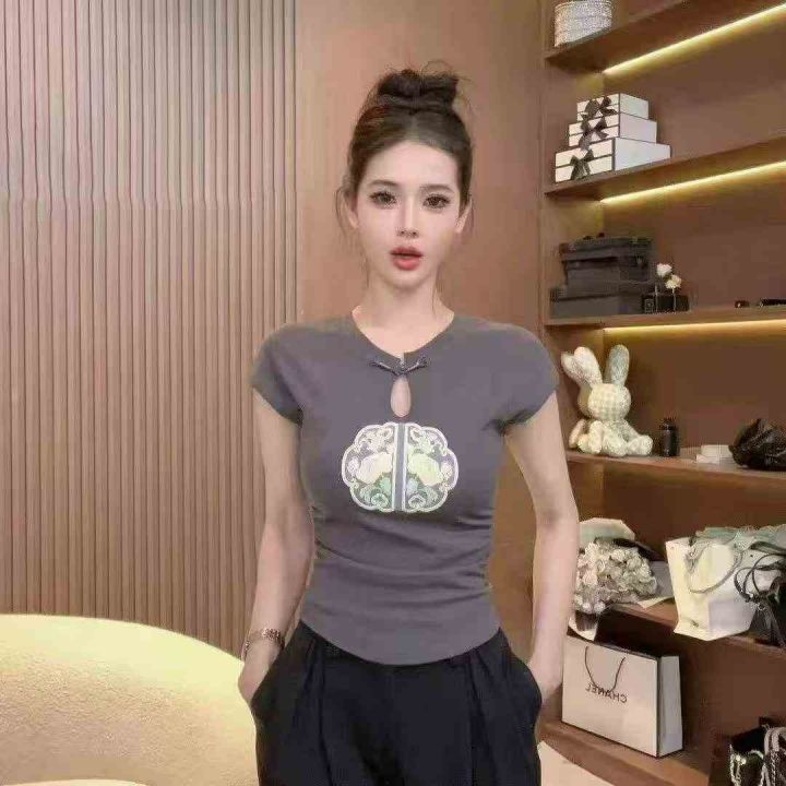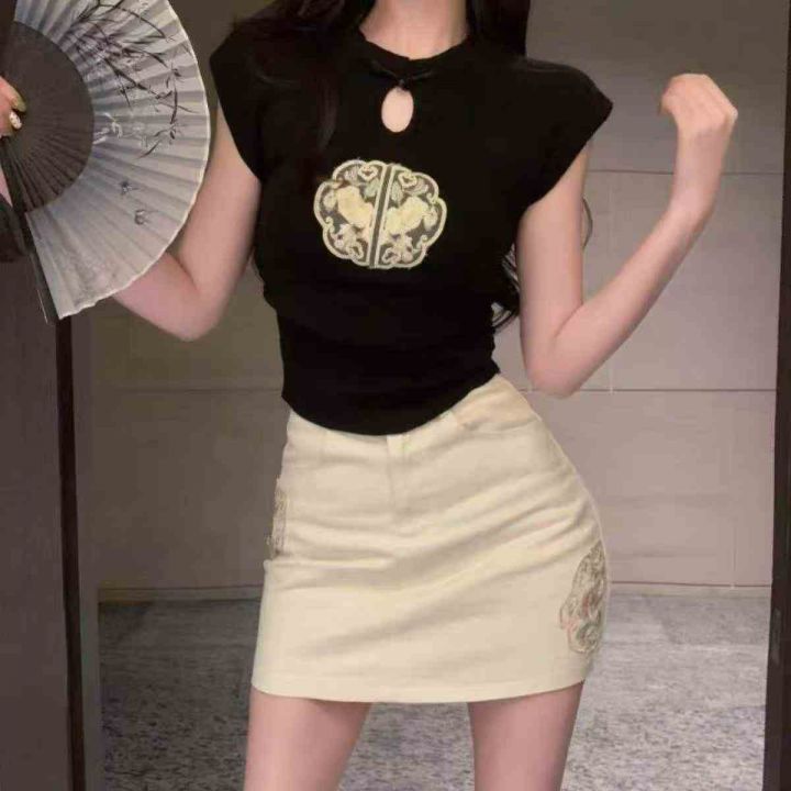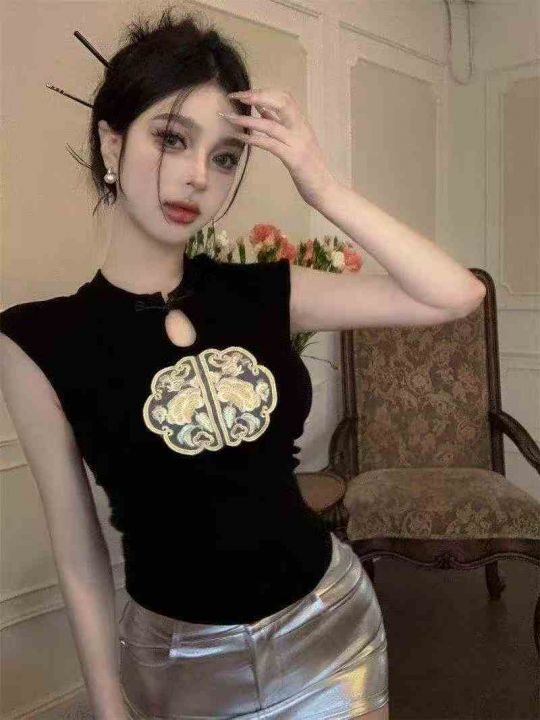 夏季新款复古新中式盘扣国风刺绣设计感百搭针织小衫,...