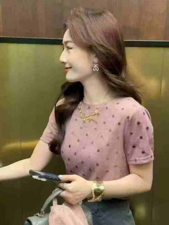 重工晕染波点圆领短袖T恤女夏季设计感显瘦遮肉气质上衣,整款2色,紫色为主,弹力超大,2到5码,3200件左右,4.9秒杀,分货加1
