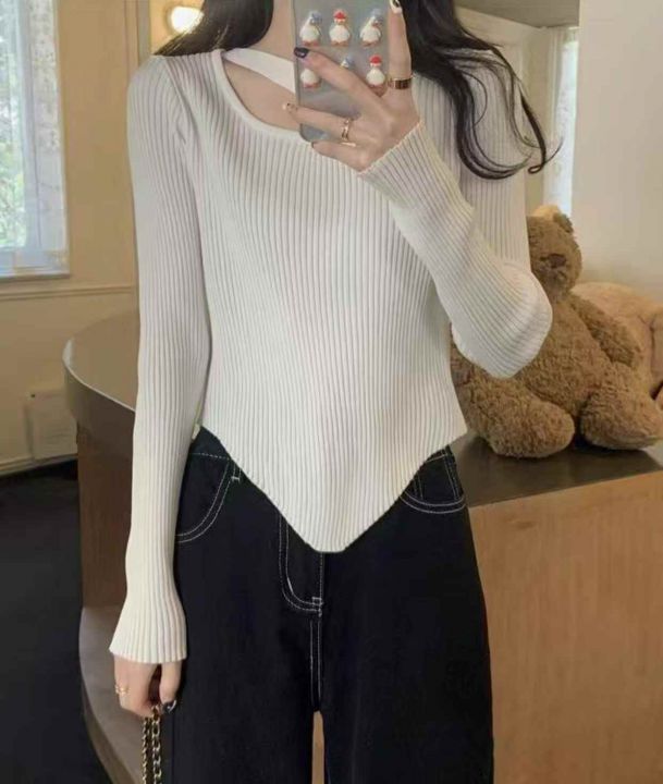 春秋新款网红设计感小众不规则洋气弹力修身显瘦坑条包芯纱套头毛衣,独立包...