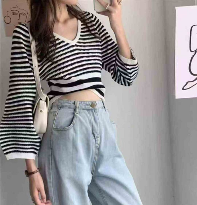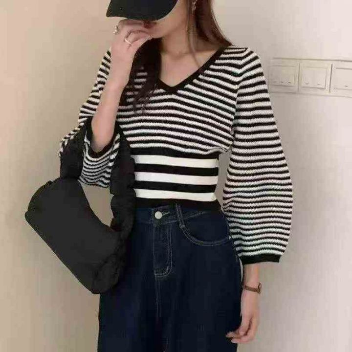 秋季新品撞色条纹宽松慵懒风短款针织V领套头毛衣,独...