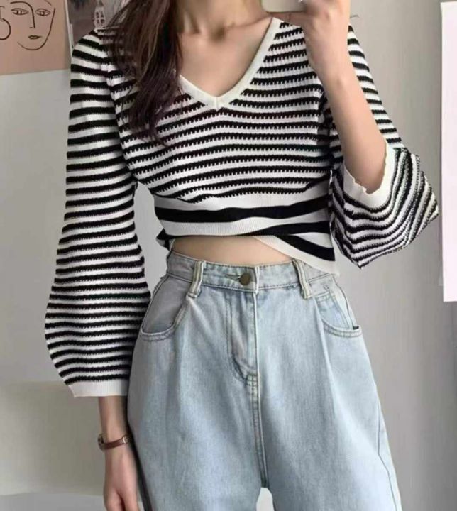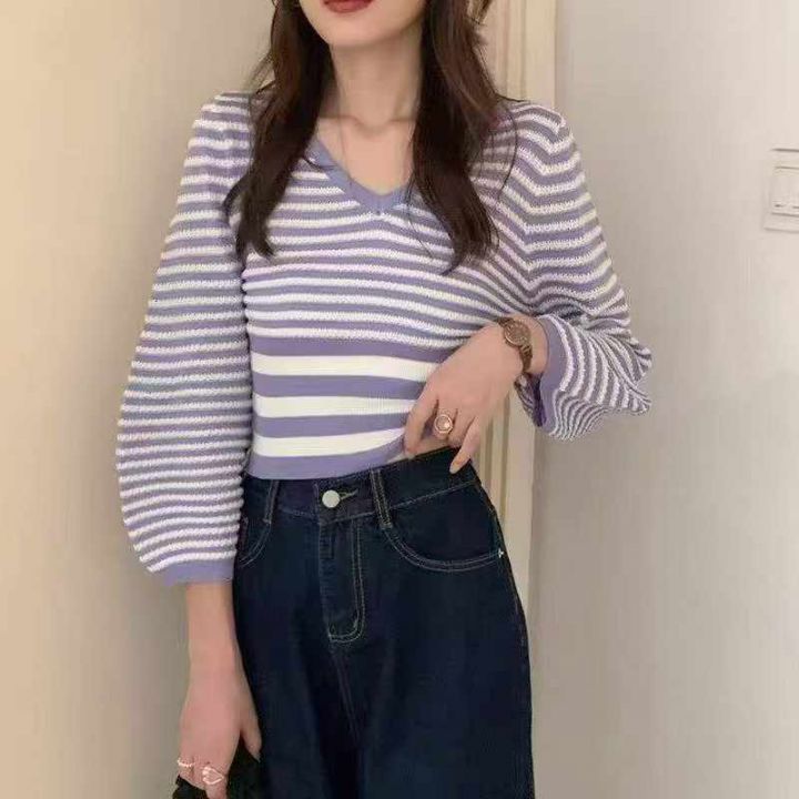 秋季新品撞色条纹宽松慵懒风短款针织V领套头毛衣,独...