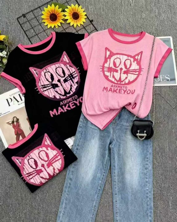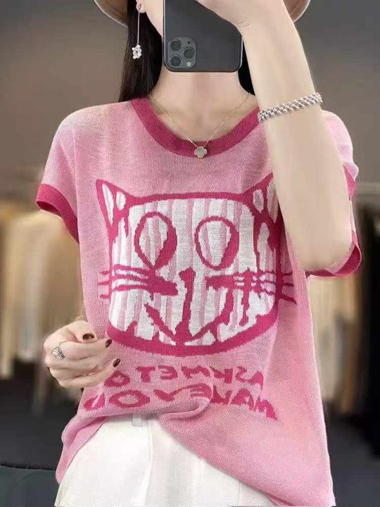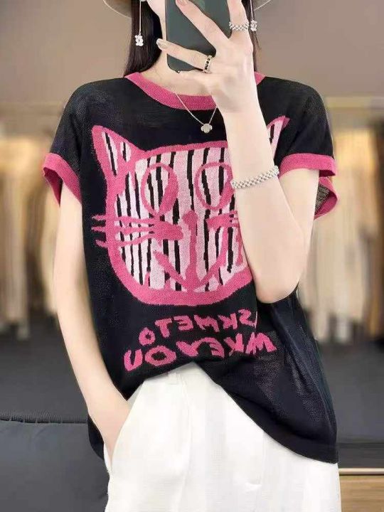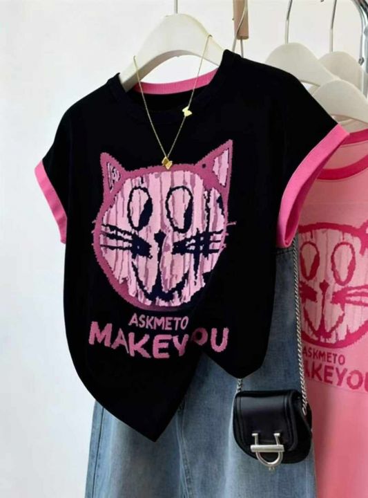 夏季新款时尚设计感拼色猫咪提花宽松慵懒风显瘦落肩针...
