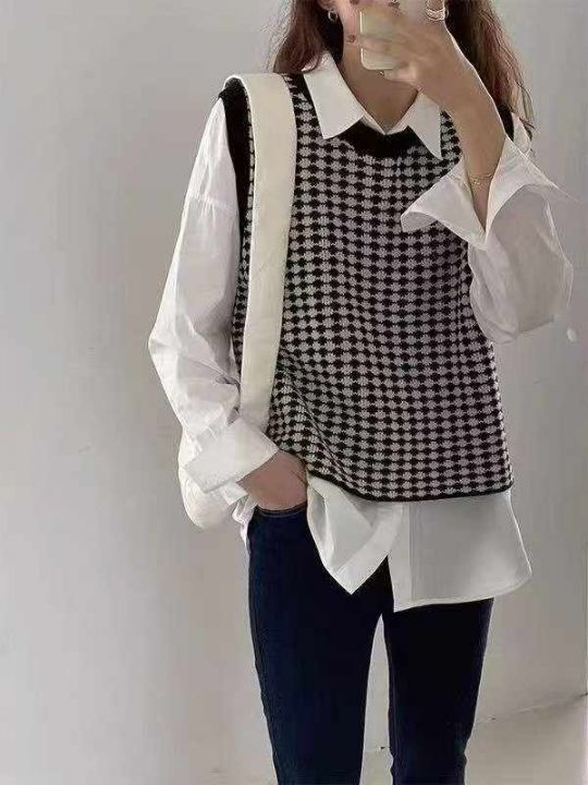 秋季新款韩版复古撞色提花宽松叠穿针织毛衣马甲背心,...