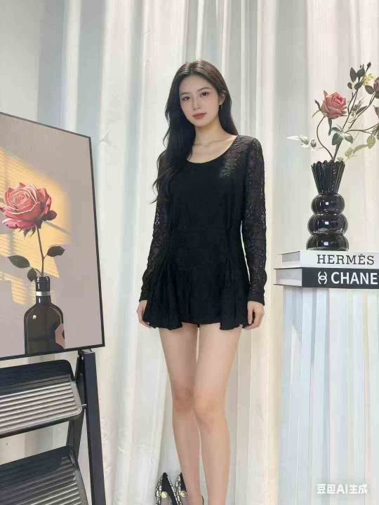 220件春季复古中长款下摆收褶设计圆领蕾丝风长袖大码T...