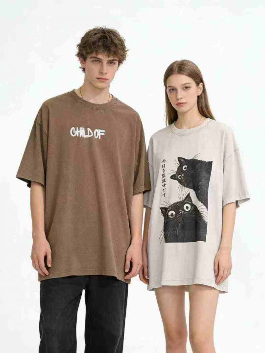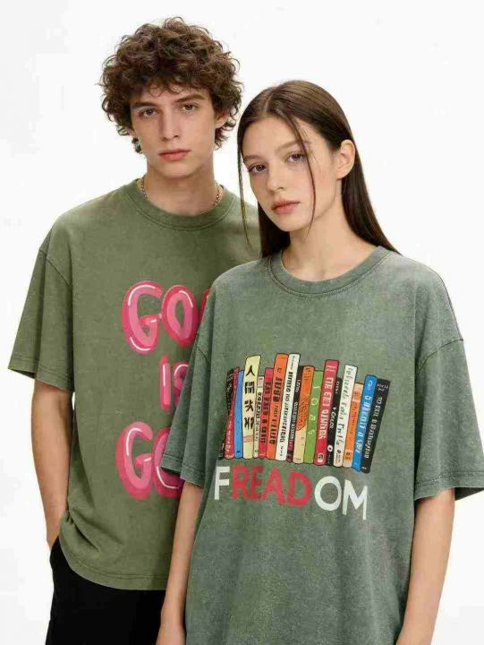 夏季潮流美式复古做旧水洗100%纯棉短袖t恤爆款印花宽...