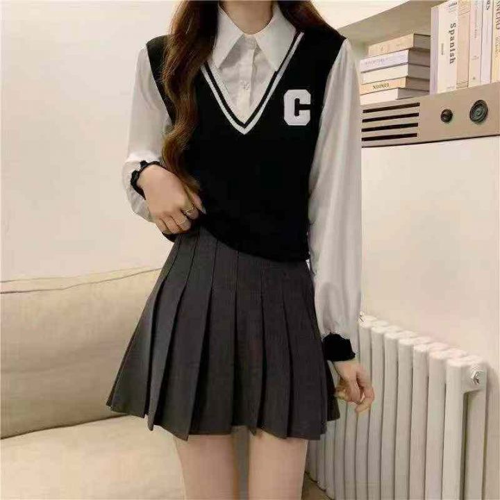 春季新款复古学院风刺绣小标假2件衬衣拼接套头毛衣,独立包装,均码面料柔...