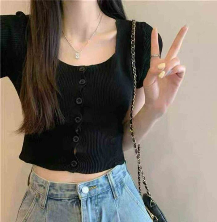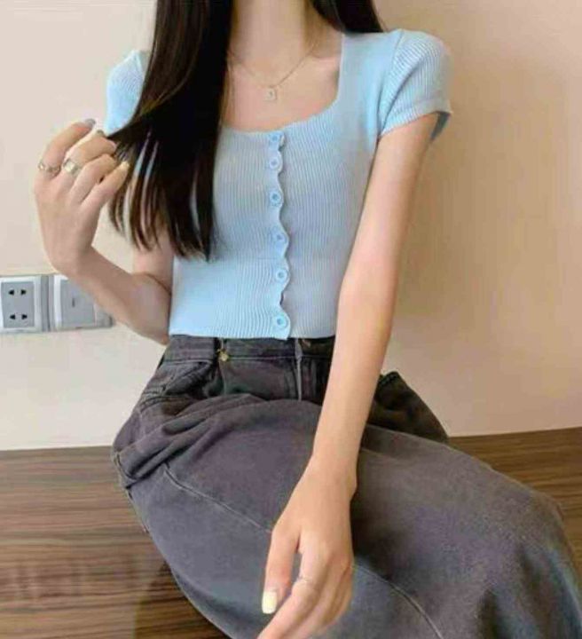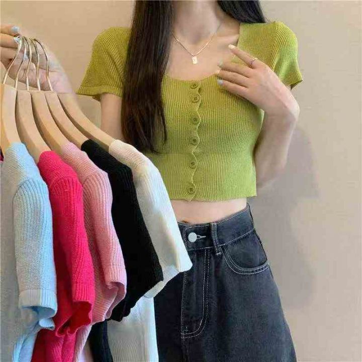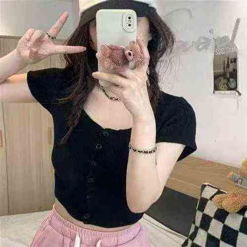 夏季新款网红复古净版简约弹力修身显瘦针织短袖毛衣开...