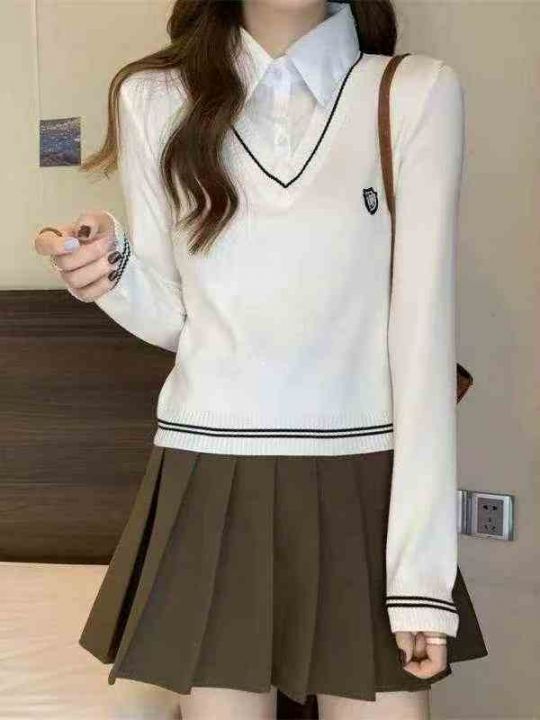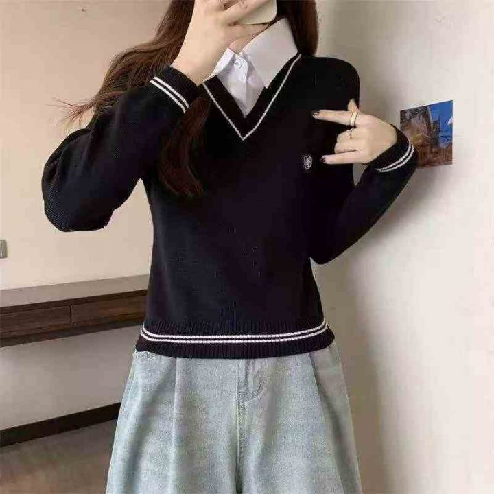 春季新款复古学院风刺绣小标假2件衬衣拼接套头毛衣,...