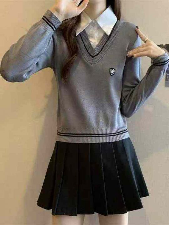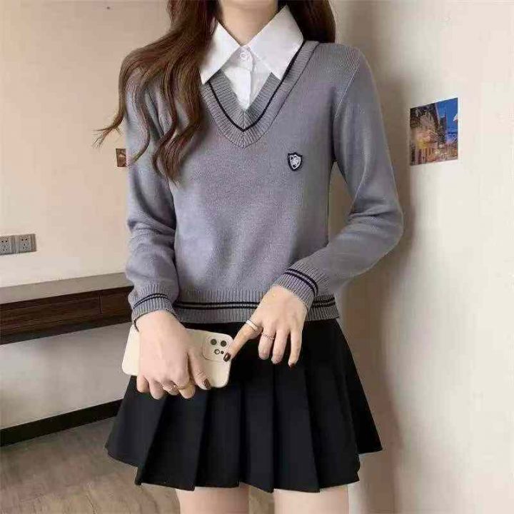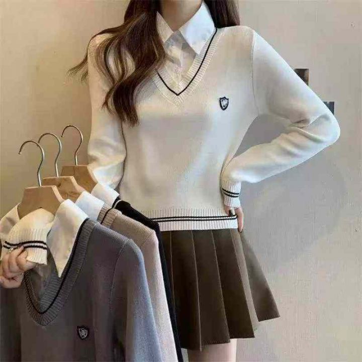 春季新款复古学院风刺绣小标假2件衬衣拼接套头毛衣,...