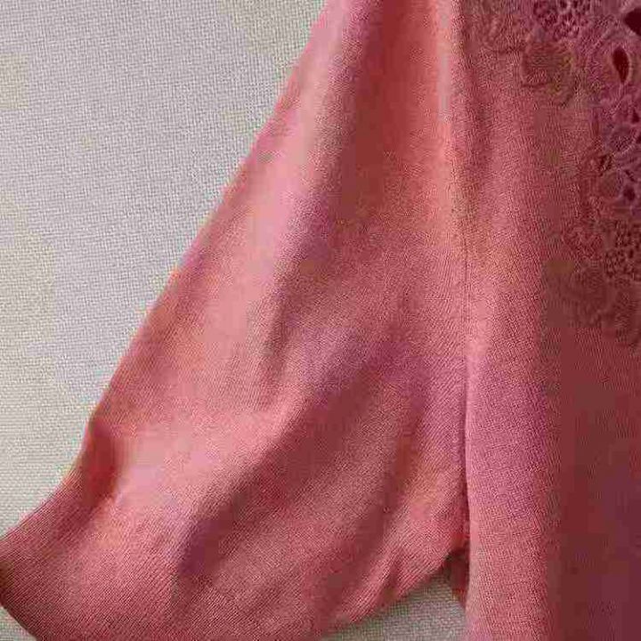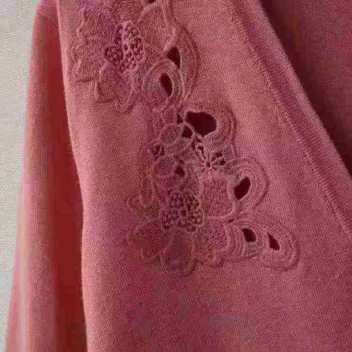 外贸原单春秋女士开衫提花西瓜红半袖中袖V领修身收腰...