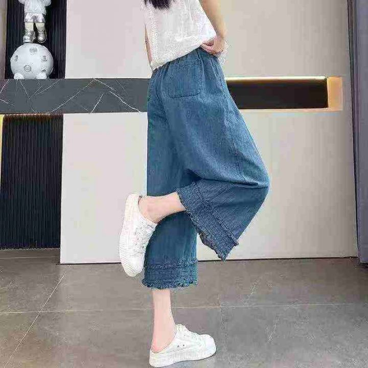 夏季新款花边拼接纯色减龄显瘦直筒阔腿牛仔裤,独立包...