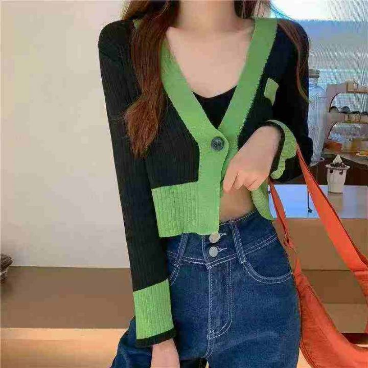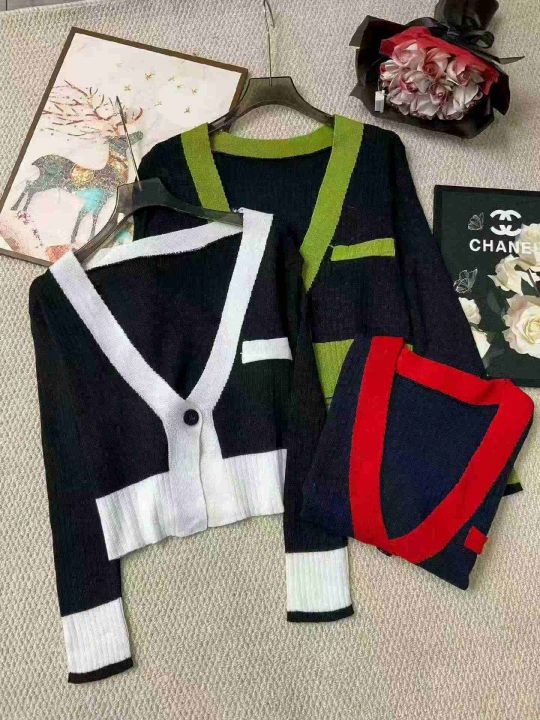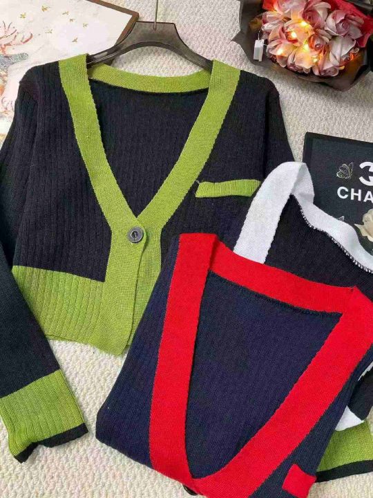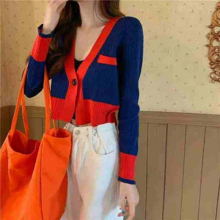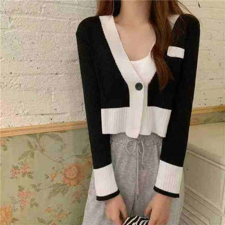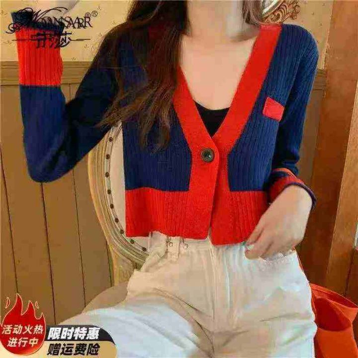 春秋新款V领拼色韩版小香风一粒扣针织毛衣开衫,独立...