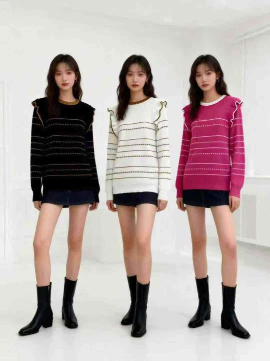 ① 清冷感荷叶边条纹长袖针织打底衫毛衣!整款三色,独立包装,黑色多,码...