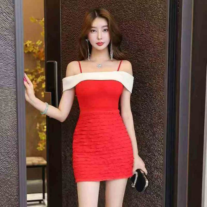 74条韩版一字肩性感吊带晚礼服包臀短款低胸气质高端名...
