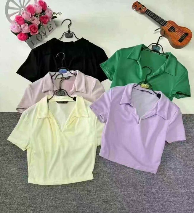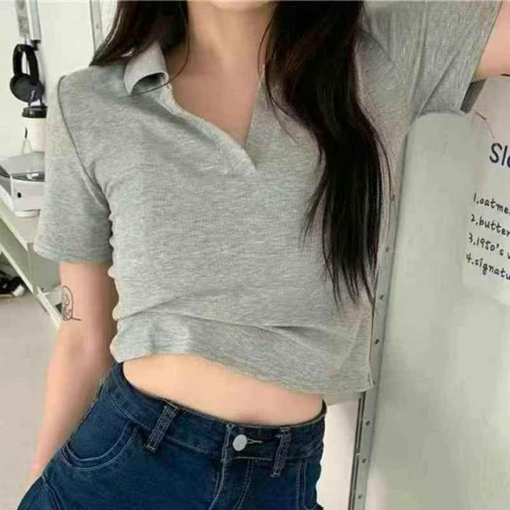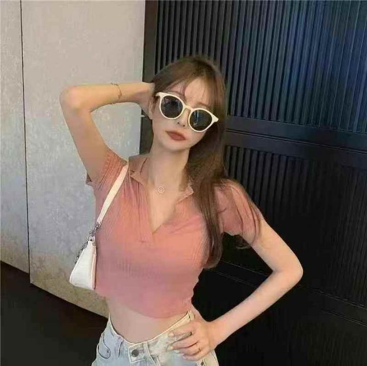 5000件小整杂 时尚辣妹风Polo领大V短袖T恤女夏修身百搭高腰露脐短款上衣打底衫 防水袋包装 3.8清 分货500件起加0.5。