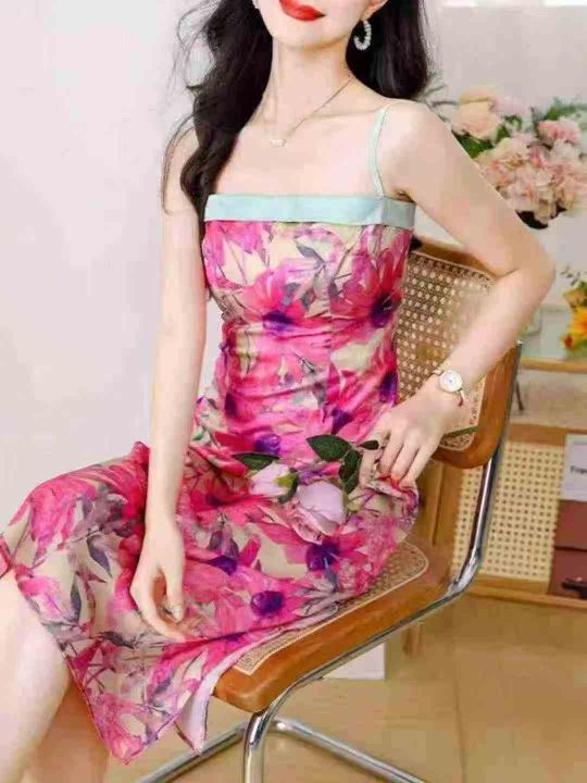 法式复古碎花拼接吊带连衣裙女士夏季新款气质修身高端包臀长裙477件,独立...