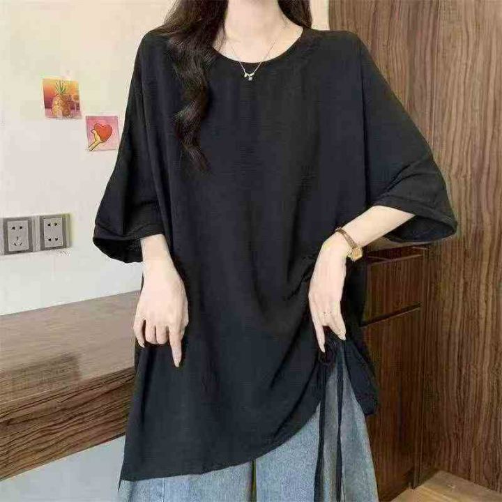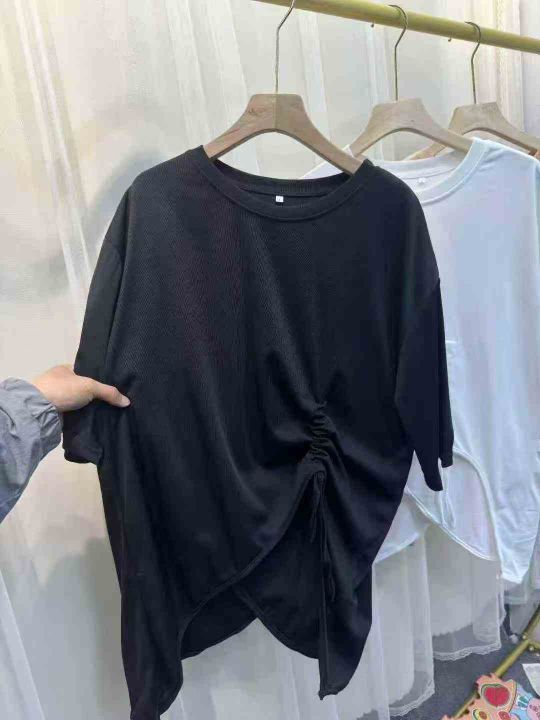 网红开衩不规则中长款中袖抽绳防晒衣t恤女夏洋气时髦...